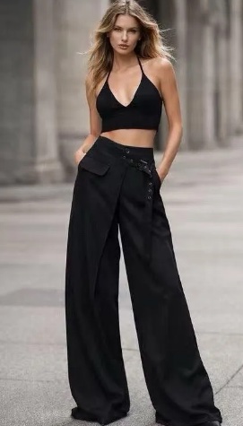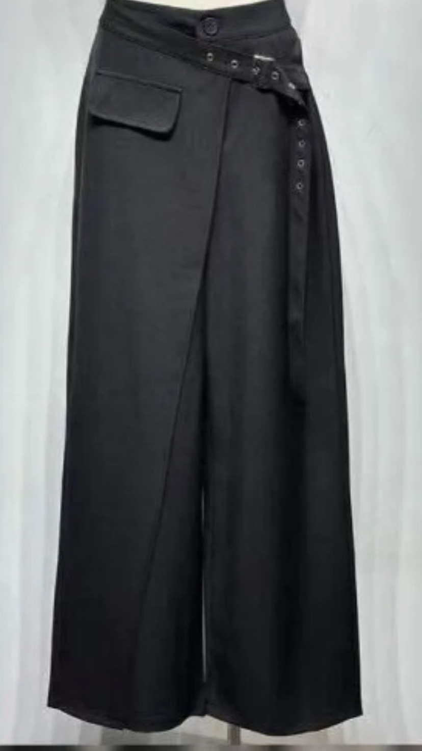 Μαύρο παντελόνι σε φαρδιά γραμμή (wide leg) με ιδιαίτερη κατασκευή στη μέση που ξεχωρίζει. Διαθέτει διακοσμητική ζώνη με μεταλλικά τρουκς και ασύμμετρη τσέπη μπροστά, προσδίδοντας σύγχρονο, urban χαρακτήρα. Η άνετη εφαρμογή του το καθιστά ιδανικό για all-day εμφανίσεις με στιλ.